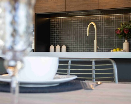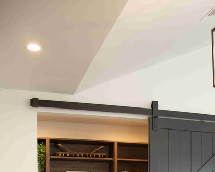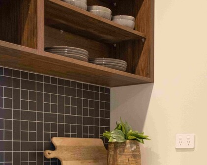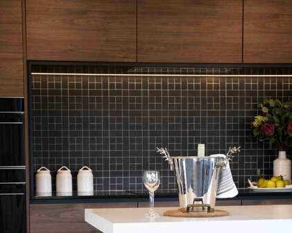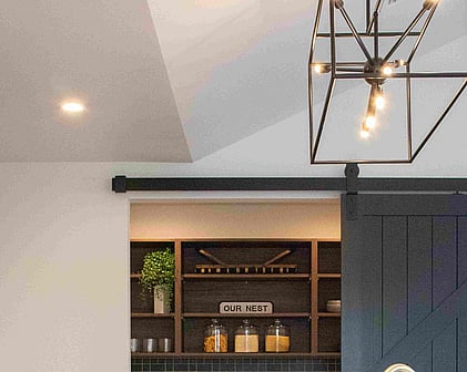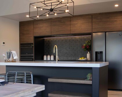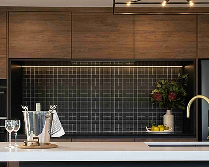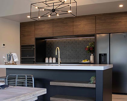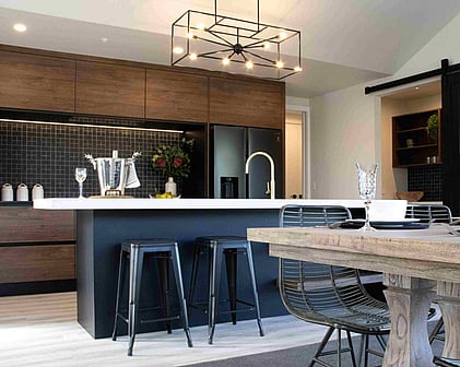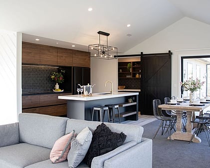 A kitchen and scullery for a modern country style home. Island benchtop is Caesarstone Fresh Concrete, and Jet Black granite on the hob bench. Sage Eclipse cabinetry on the island with Prime Melamine, Hickory Walnut used for the back wall, and black gola handles to link the black throughout the kitchen. Black and woodgrain cabinetry used in the scullery to keep continuity, and Fit Tanova ventilated drawers in the Coal colour. Beautiful tiled splashback to add texture, and black barn door adds to the overall look. Love it!